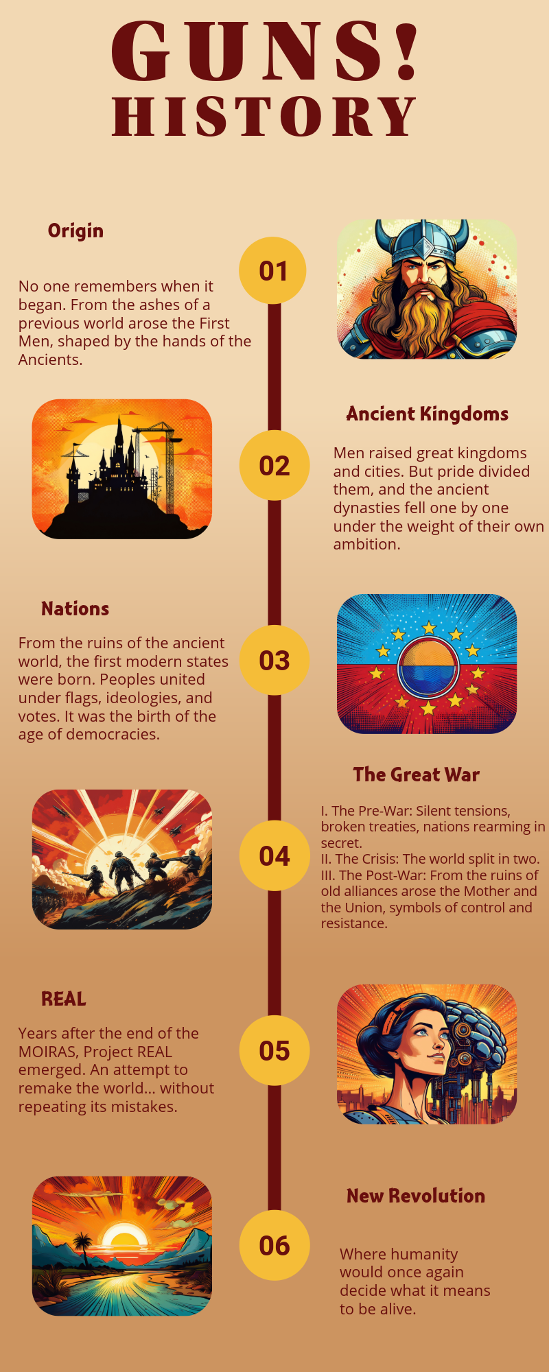 The world of Guns is not confined to a single story or a single era. From the mythic origins of the First Men, through the fall of ancient kingdoms, the rise of modern nations, and the great wars that redefined power, to the projects that sought to remake the world and the revolutions still yet to come, the Guns universe is one in constant expansion. Looking ahead, new stories will explore each of these periods, revealing the characters, conflicts, and decisions that shaped the world as we know it. Each era stands as a different chapter of the same question: what does it mean to be alive in a world marked by violence, ambition, and the necessity of choice?